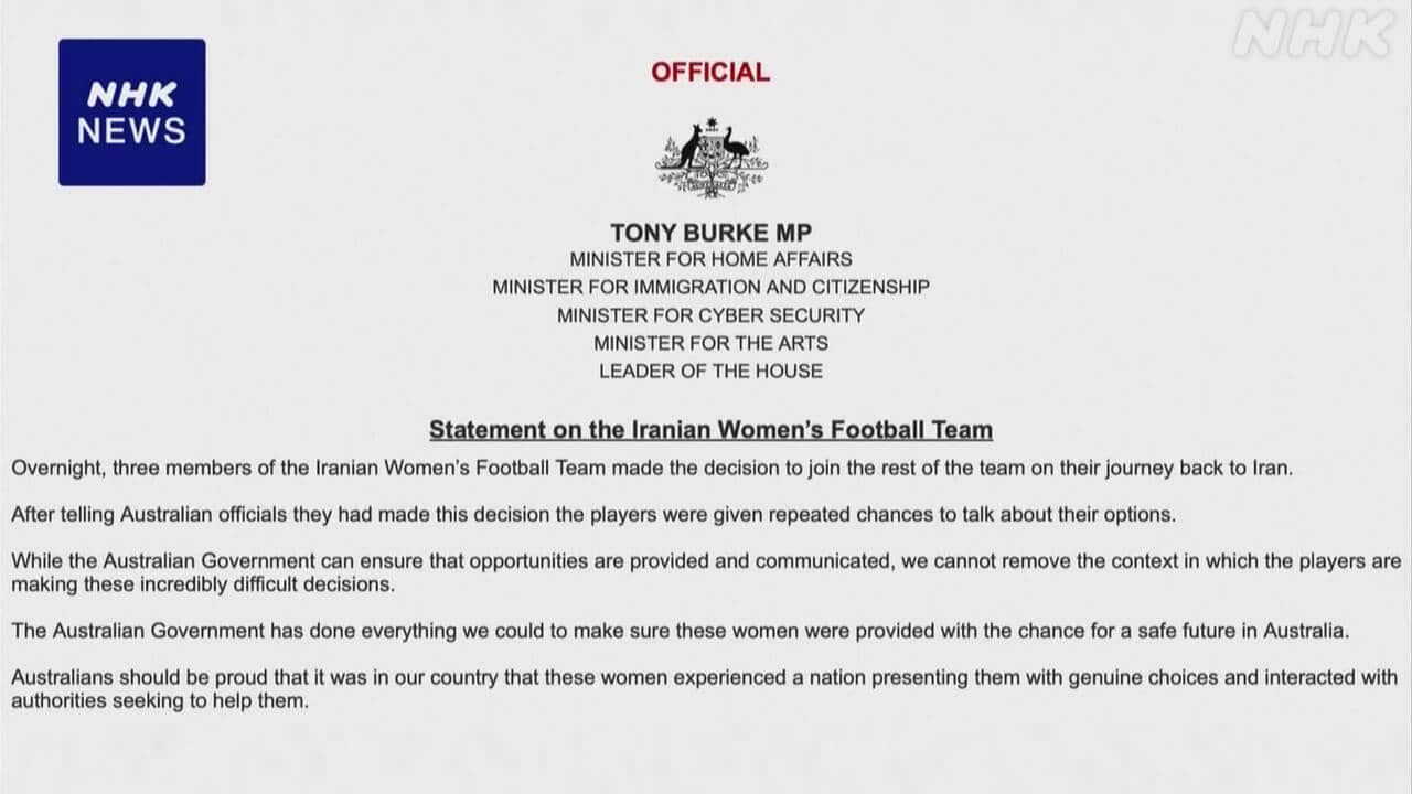 豪 サッカー女子イラン代表選手ら7人にビザ発給も 4人が帰国へ