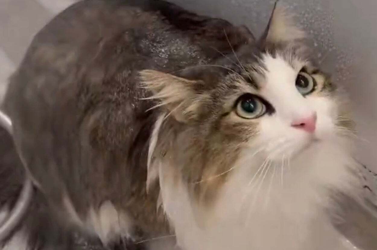 「ぜったい前世人間だ」猫ちゃんのシャワータイムにSNSほっこり「なんと優雅な猫ちゃん!」「めちゃ良い子さんですね」