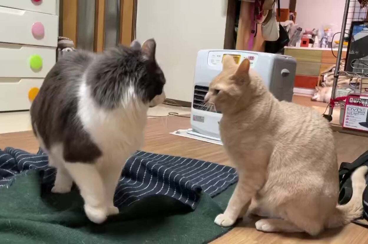 2匹の猫がにらみ合い、一触即発の状況かと思いきや……かわいい“猫パンチ(弱)”とオチに「平和な世界」とSNSにっこり